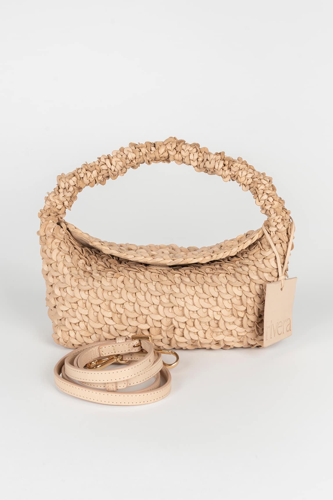 Su acabado artesanal y proporción equilibrada lo convierten en una pieza ligera pero con presencia. Incluye asa trenzada de mano y correa larga desmontable. Medidas de 10,5 x 9,5 x 4,5 cm y asa de 7,5 x 7,5 cm.