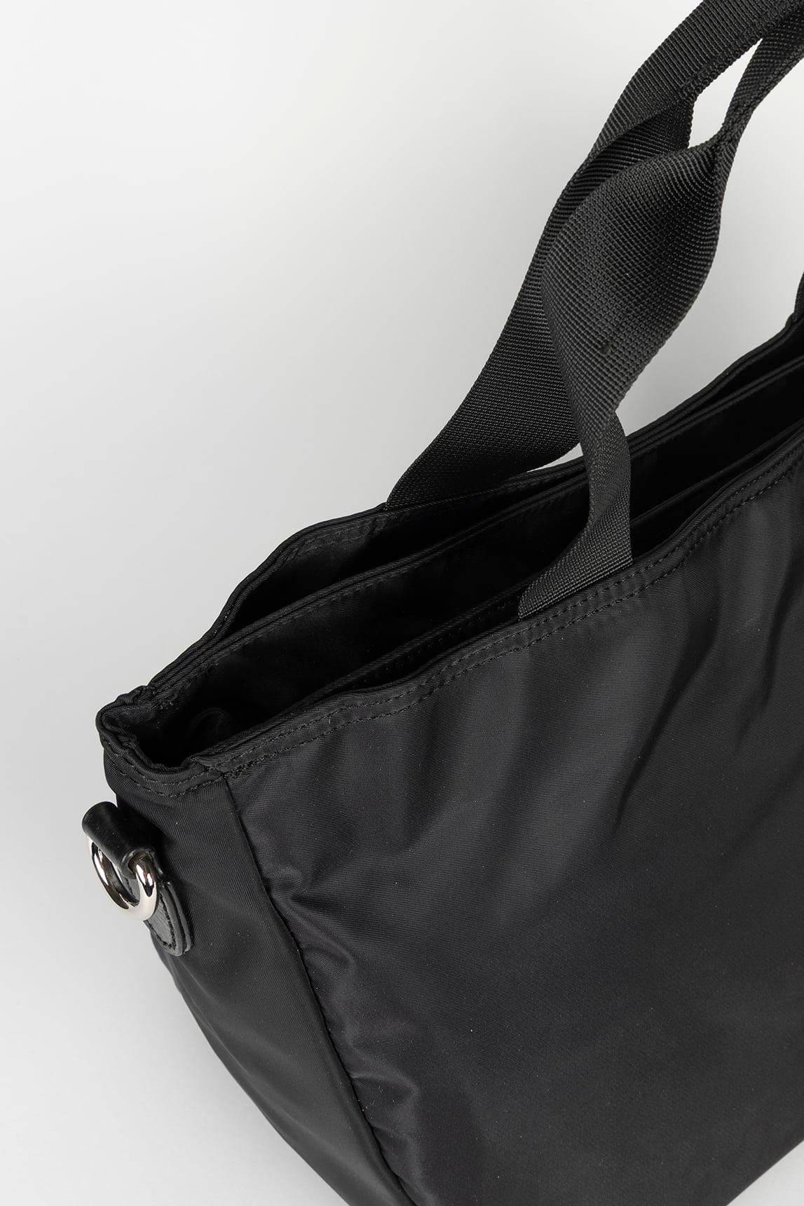 Bolso de mujer en tamaño mini confeccionado en nylon negro con silueta estructurada y acabado ligeramente satinado. El diseño presenta asa superior corta y bandolera extraíble y ajustable, permitiendo llevarlo tanto en mano como cruzado. El cierre superior con cremallera y los herrajes metálicos aportan funcionalidad, mientras su superficie lisa refuerza una estética limpia y contemporánea.