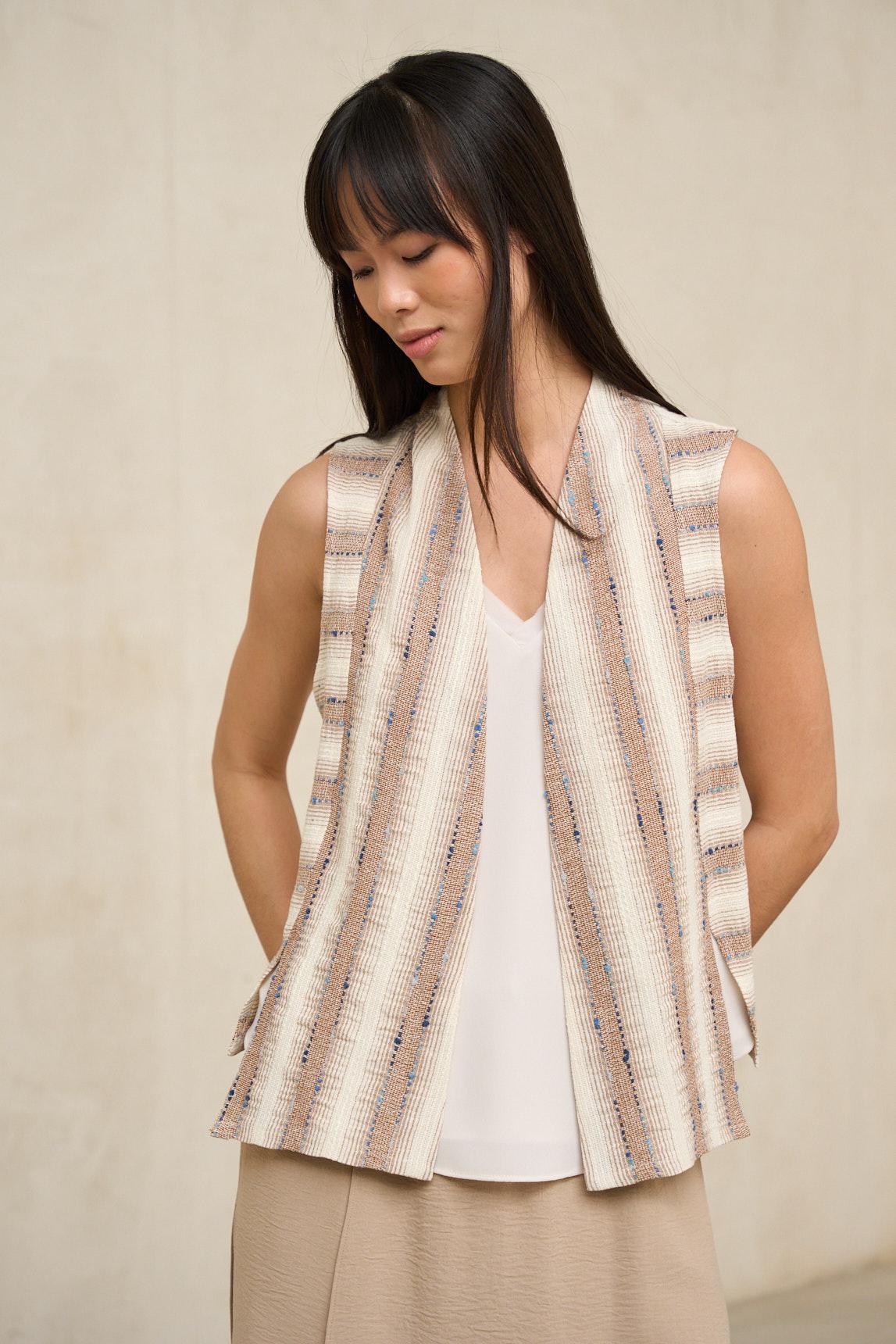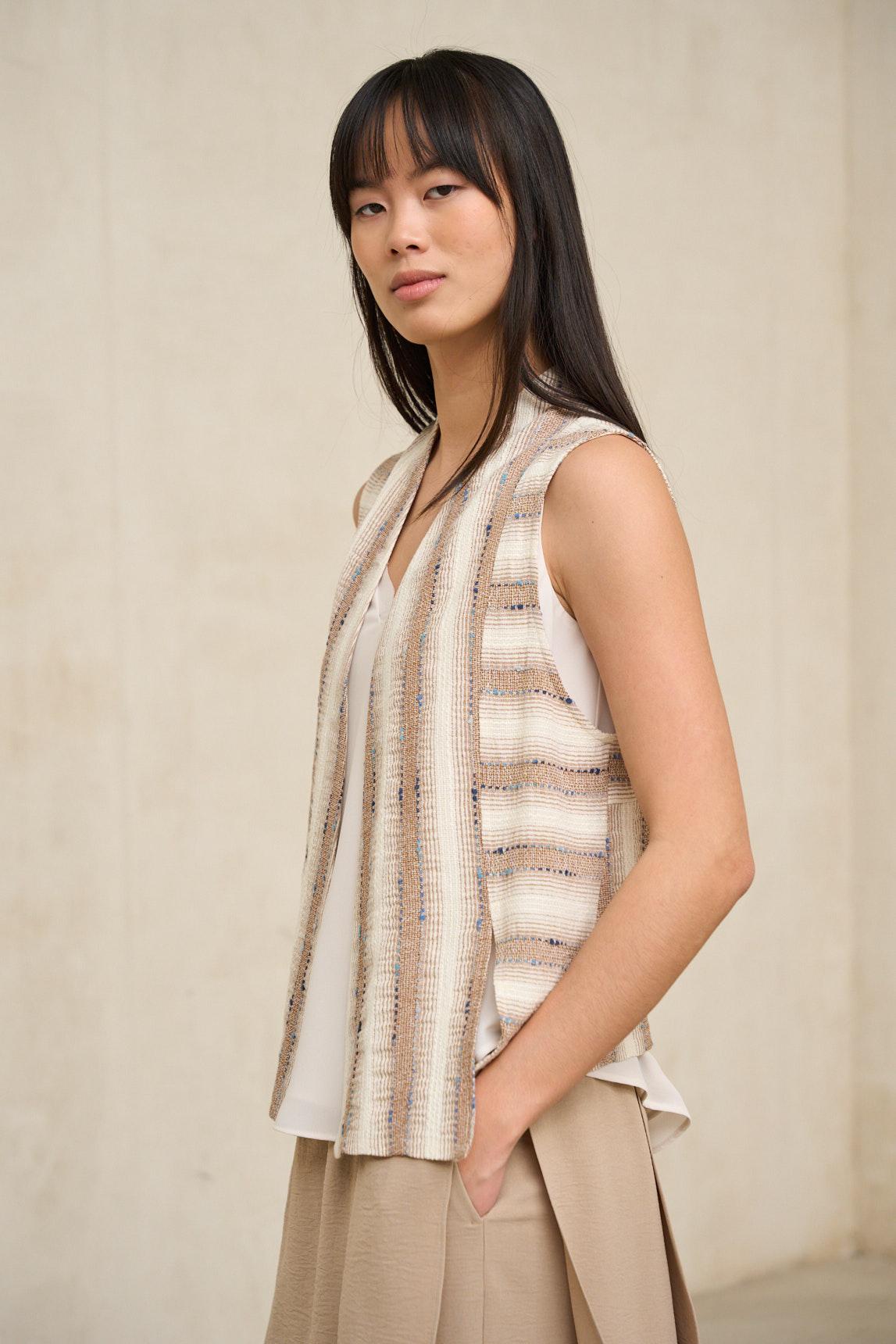 Este chaleco presenta una silueta abierta y relajada, sin cierre visible, que cae con naturalidad desde los hombros. El diseño destaca por su tejido de textura marcada con patrón geométrico en tonos arena y crudo, creando un efecto visual dinámico y artesanal. Incorpora bolsillos frontales de parche que refuerzan su carácter funcional, mientras que el corte recto y el largo a la cadera aportan equilibrio y comodidad. La estructura es ligera y permite superposición sin añadir rigidez al conjunto. En términos de estilo, es una prenda exterior versátil con inspiración étnica y contemporánea. Su fit relajado facilita llevarlo sobre camisetas básicas, blusas fluidas o prendas de punto fino, aportando textura y profundidad al look. Los tonos neutros permiten combinarlo con pantalones claros, denim o gamas tierra, integrándose con facilidad en armarios de estética natural. Pensado para completar estilismos de entretiempo, este chaleco aporta carácter sin sobrecargar. Se lleva abierto, acompañando el movimiento y sumando una capa visual interesante que transforma conjuntos sencillos en propuestas con personalidad y equilibrio. Nos esforzamos por mostrar los colores de la forma más fiel posible, pero pueden variar ligeramente respecto a la realidad.