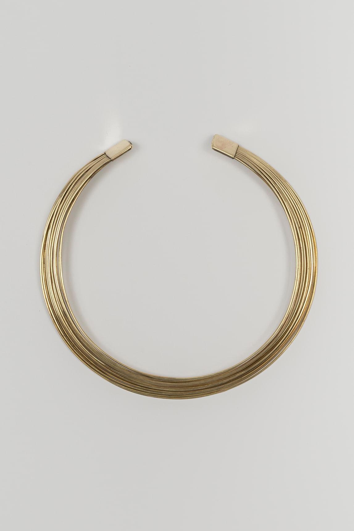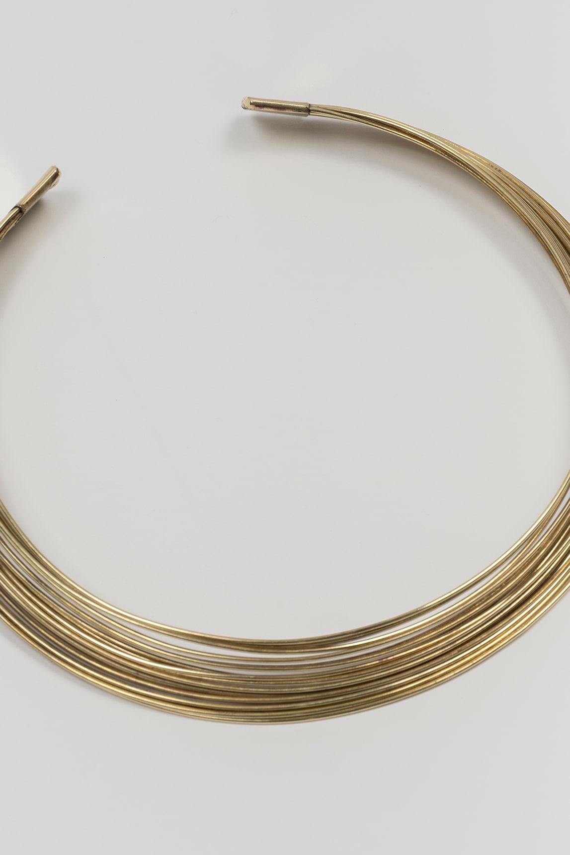 Women's brass necklace with a multi-chain design and a rigid open choker-style structure. The piece is composed of several thin overlapping lines that create an enveloping, light, and very visual effect around the neck, adding shine and a sophisticated presence without being excessive. Its clean and open shape reinforces a contemporary, elegant, and very easy-to-integrate aesthetic.