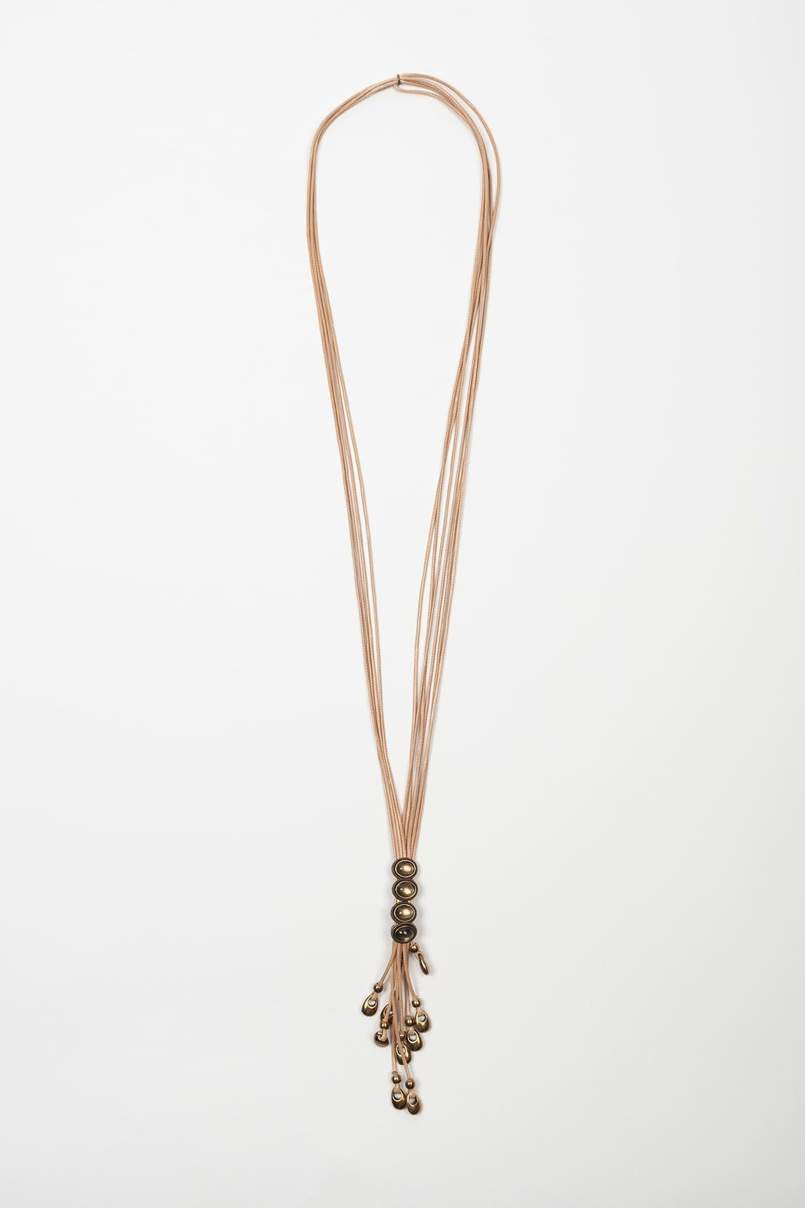 O colar Selvara mantém a sua estrutura de corrente dupla em ouro com um pendente estilizado e um conjunto central de pequenos pendentes que acrescentam textura e movimento. Nesta versão, os detalhes são fabricados em latão, oferecendo um tom de ouro envelhecido que se harmoniza com a base do colar e reforça o seu carácter quente e natural. A combinação cria um efeito uniforme e elegante, ideal para looks em tons de areia, camel, linho natural ou terra. É uma peça versátil que acrescenta sofisticação sem excessos, perfeita para elevar looks simples com um toque contemporâneo e equilibrado. Esforçamo-nos por exibir as cores da forma mais precisa possível, mas podem variar ligeiramente da realidade.