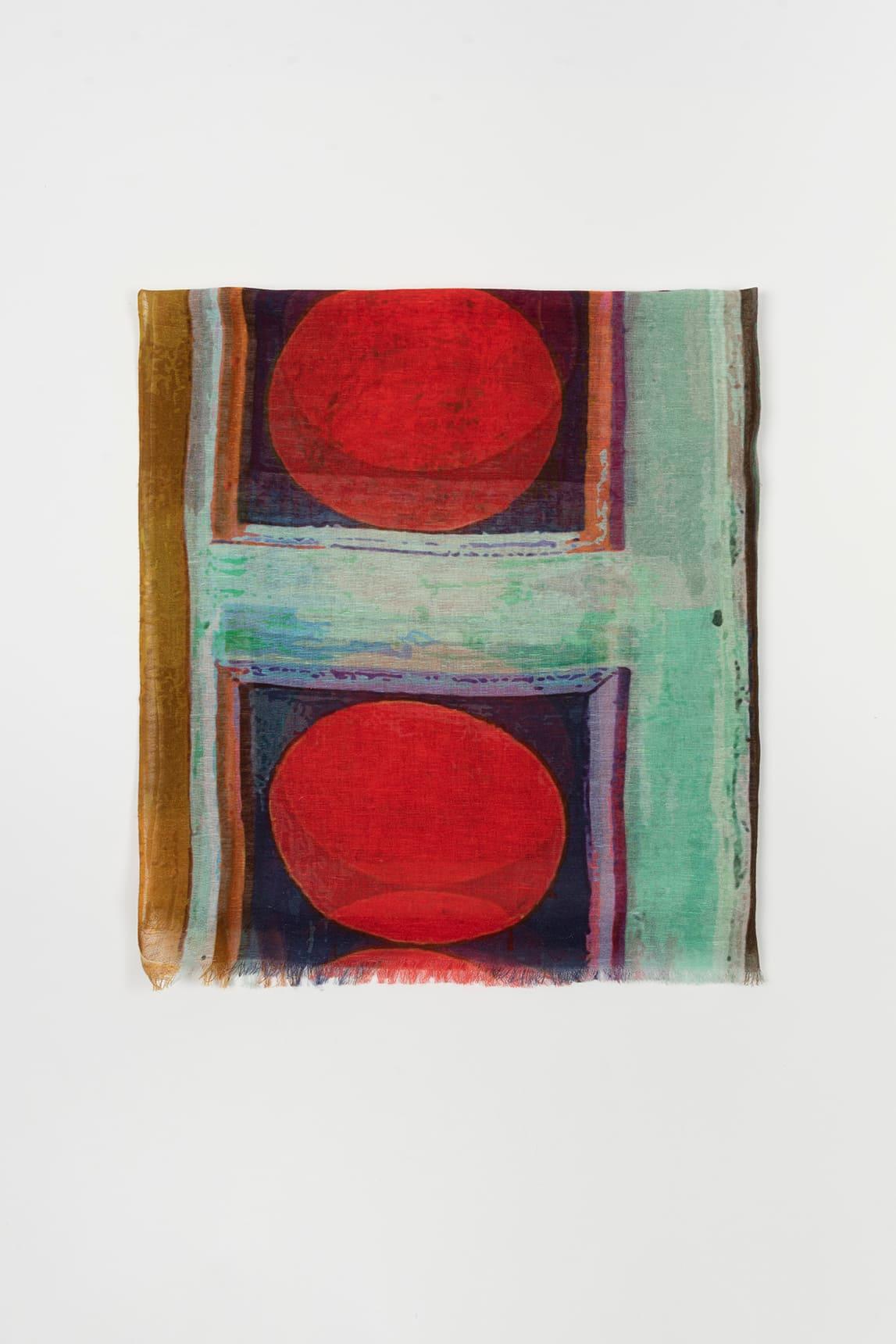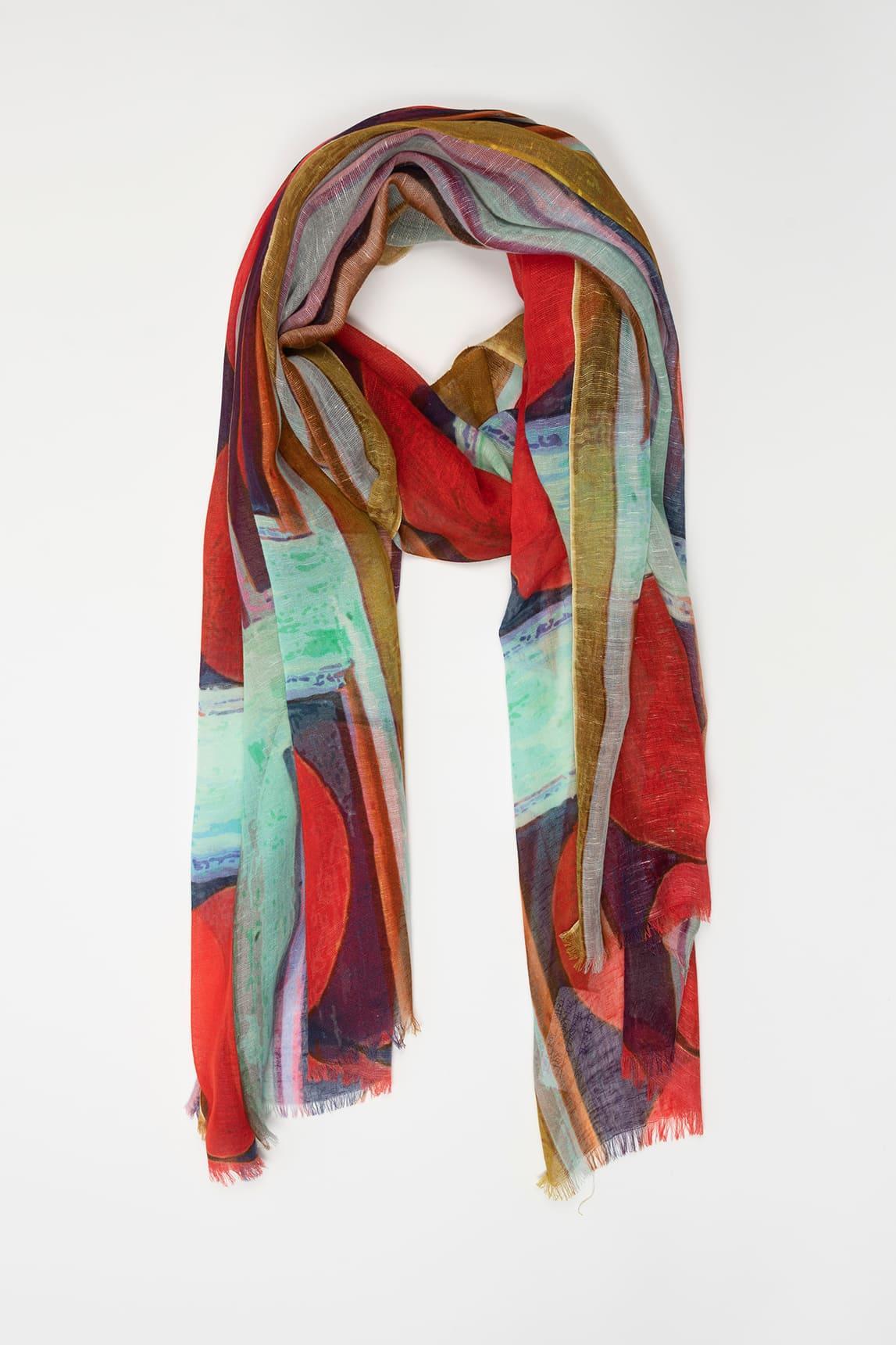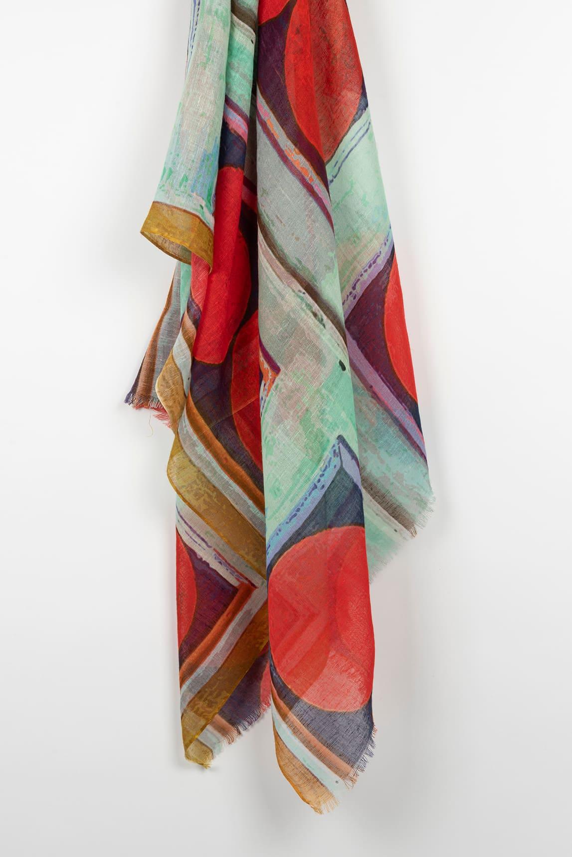 Un fular con carácter contemporáneo que equilibra color, arte y ligereza en clave sofisticada.