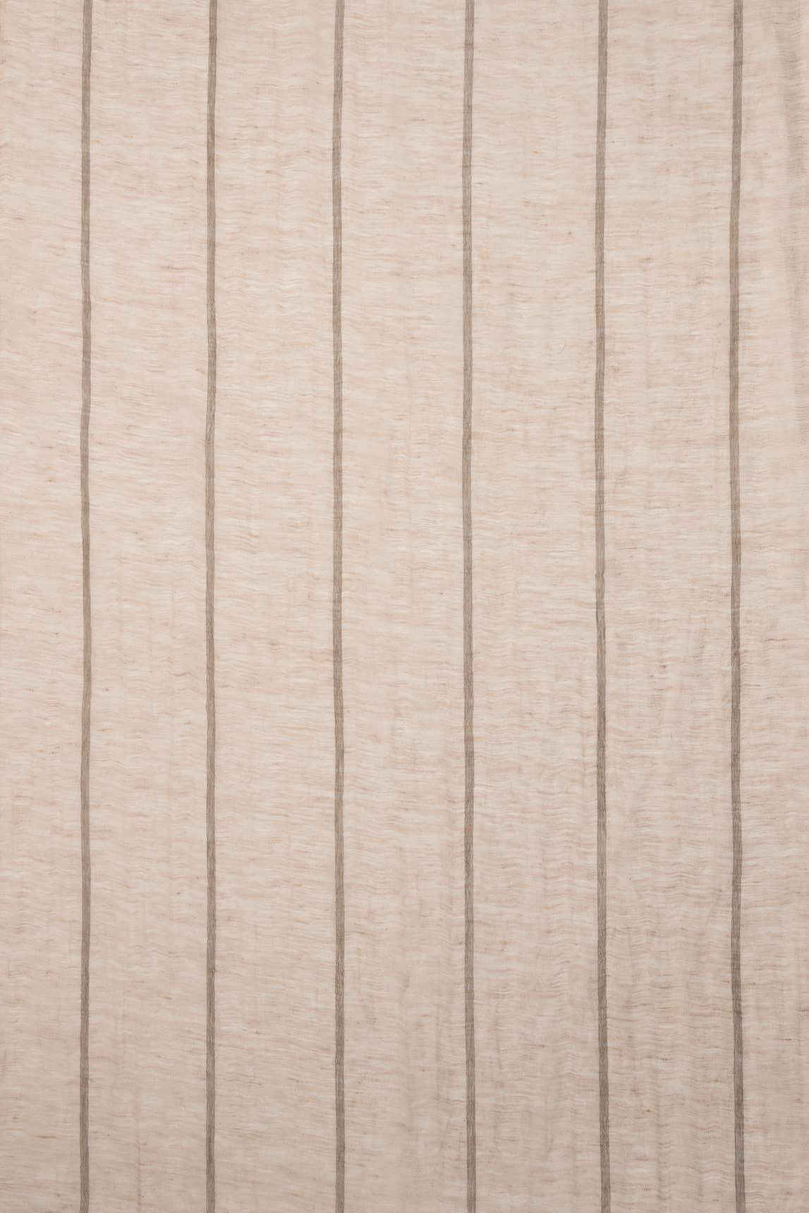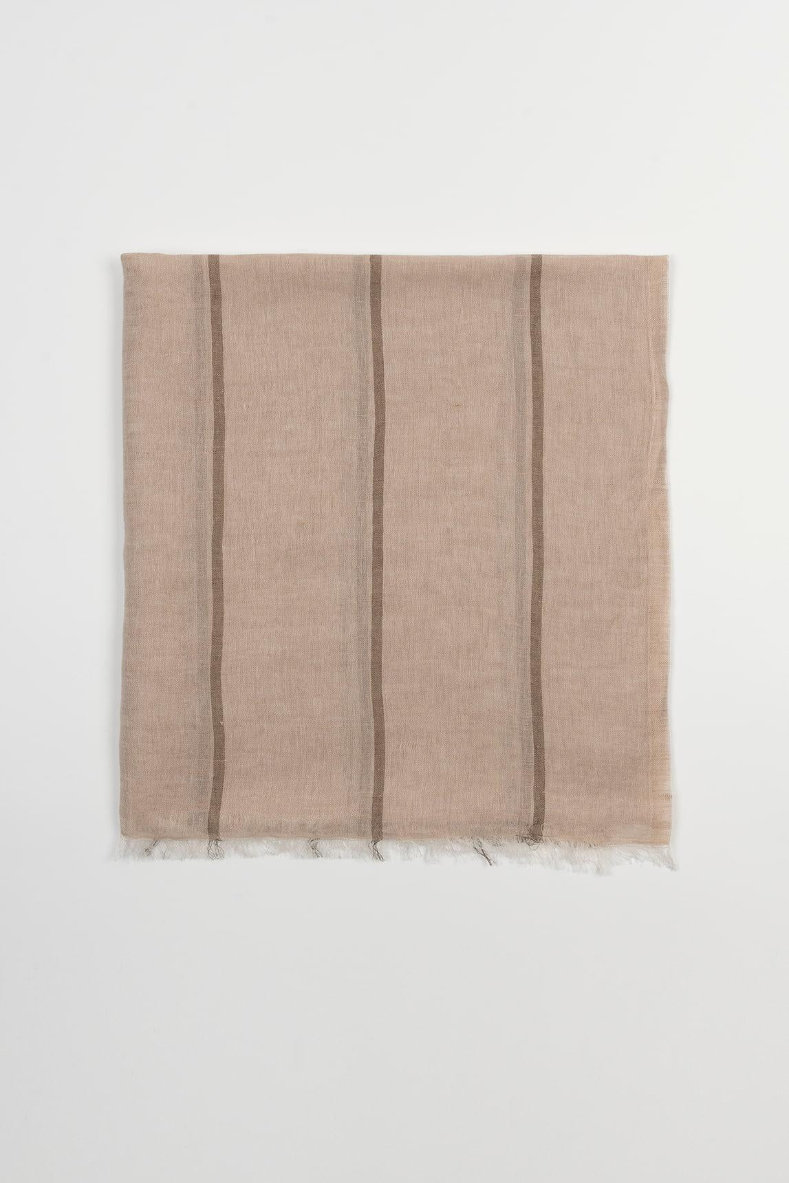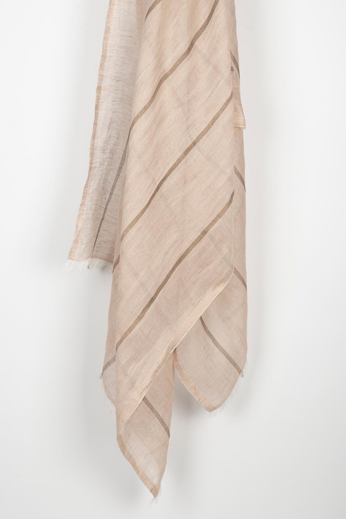 Women's scarf made from a natural blend of 48% cotton and 52% linen. Its lightweight, breathable fabric features a design of fine diagonal stripes in a sandy tone on a light base, adding texture and a handcrafted feel. Subtly frayed edges complete the relaxed and natural finish.