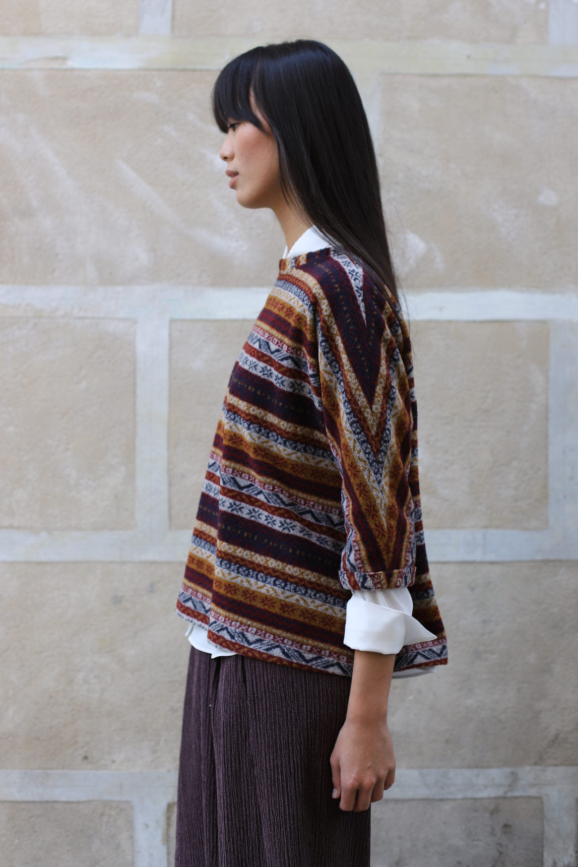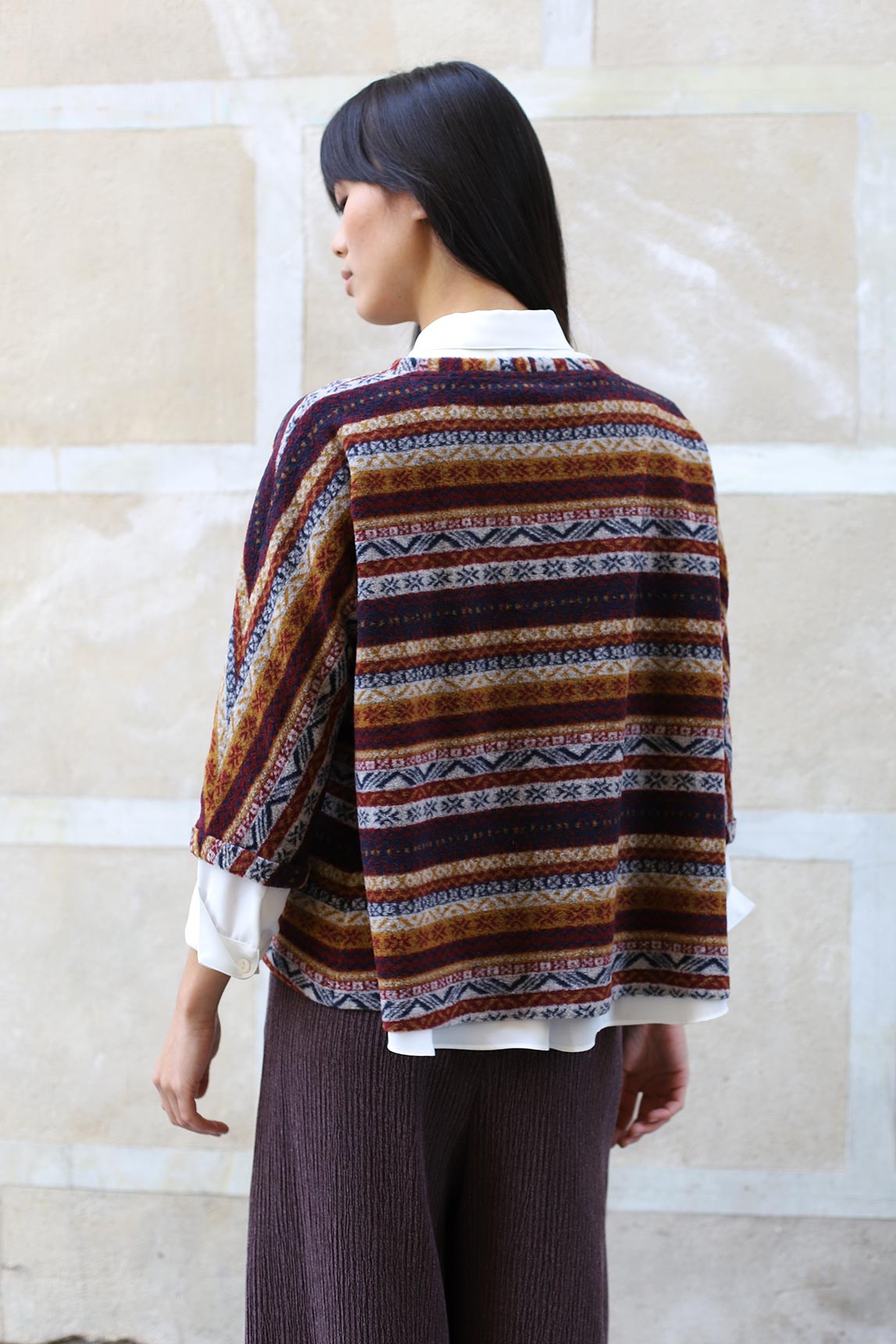 El jersey Urbino de mujer es la pieza fácil que levanta cualquier look. Su tejido suave combina tonos burdeos, mostaza, azul marino y crudo en franjas geométricas, aportando calidez visual sin perder ligereza. El corte recto con caída suave estiliza y permite superponer camisas o camisetas finas; la manga 3/4 y el cuello caja equilibran el volumen para un resultado favorecedor. Perfecto para el día a día, viajes o, con pantalón sastre, para la oficina. Combínalo con vaquero oscuro, culotte de punto o falda midi para un conjunto cómodo y elegante.