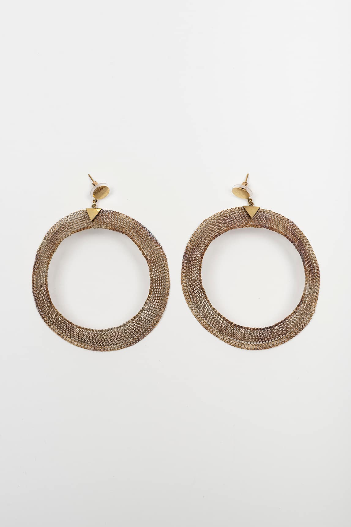 - Brincos grandes e circulares fabricados em malha metálica com acabamento em bronze envelhecido.