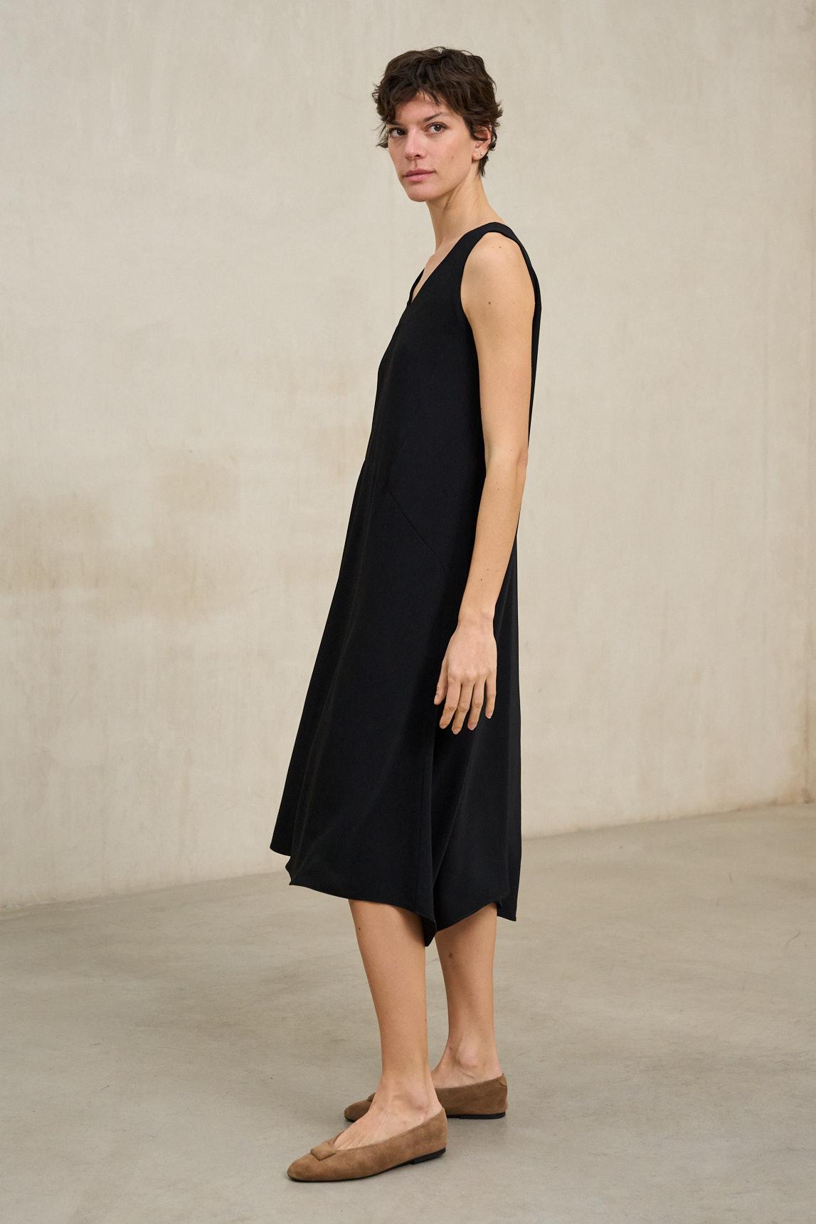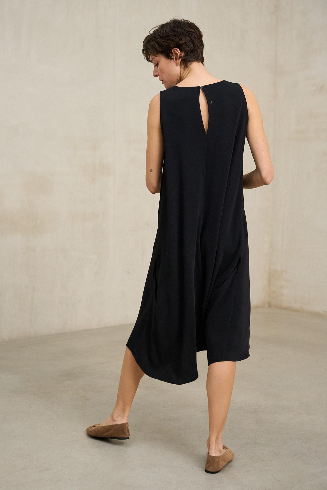 O vestido preto Naïra é uma peça de linhas simples e silhueta fluida que se destaca pelo seu corte leve e movimento natural. Fabricado em tecido suave com uma estrutura delicada, apresenta um decote em V e um design sem mangas que realça a figura, conferindo um toque contemporâneo e minimalista. O corte solto cria uma silhueta descontraída que flui a partir do corpo, acrescentando dinamismo ao caminhar e um efeito envolvente e muito elegante. O comprimento midi e a bainha ligeiramente assimétrica reforçam o seu carácter moderno e sofisticado, sendo uma opção versátil tanto para o dia como para a noite. O tom preto realça a sua intemporalidade e permite múltiplas combinações: desde sandálias rasas e bolsas de ráfia para um look casual, até acessórios metálicos e calçado mais sofisticado para ocasiões especiais. Uma peça essencial dentro de um guarda-roupa cápsula, concebida para quem procura conforto sem sacrificar uma estética requintada e feminina. Esforçamo-nos por exibir as cores da forma mais precisa possível, mas podem variar ligeiramente da realidade.