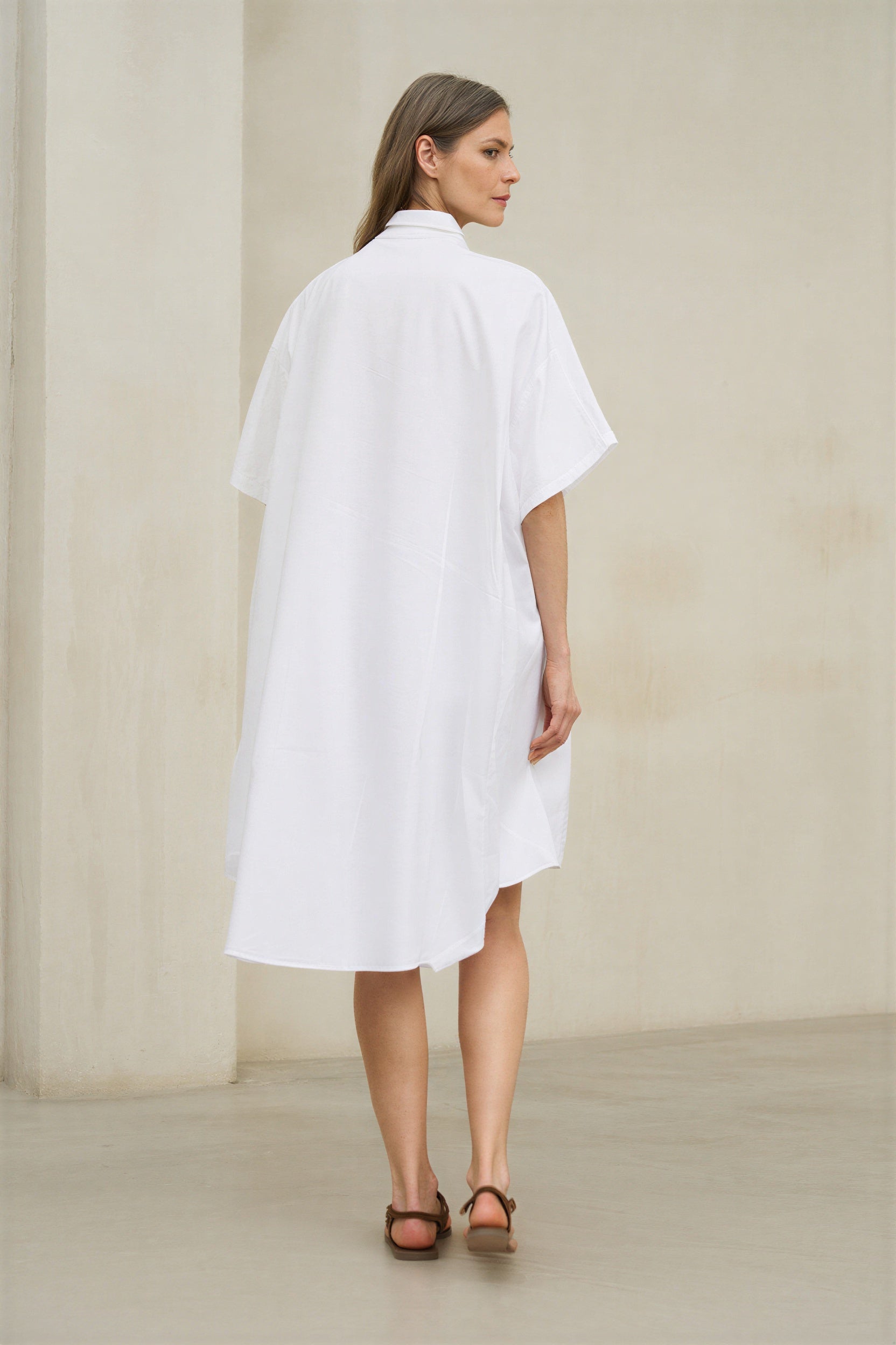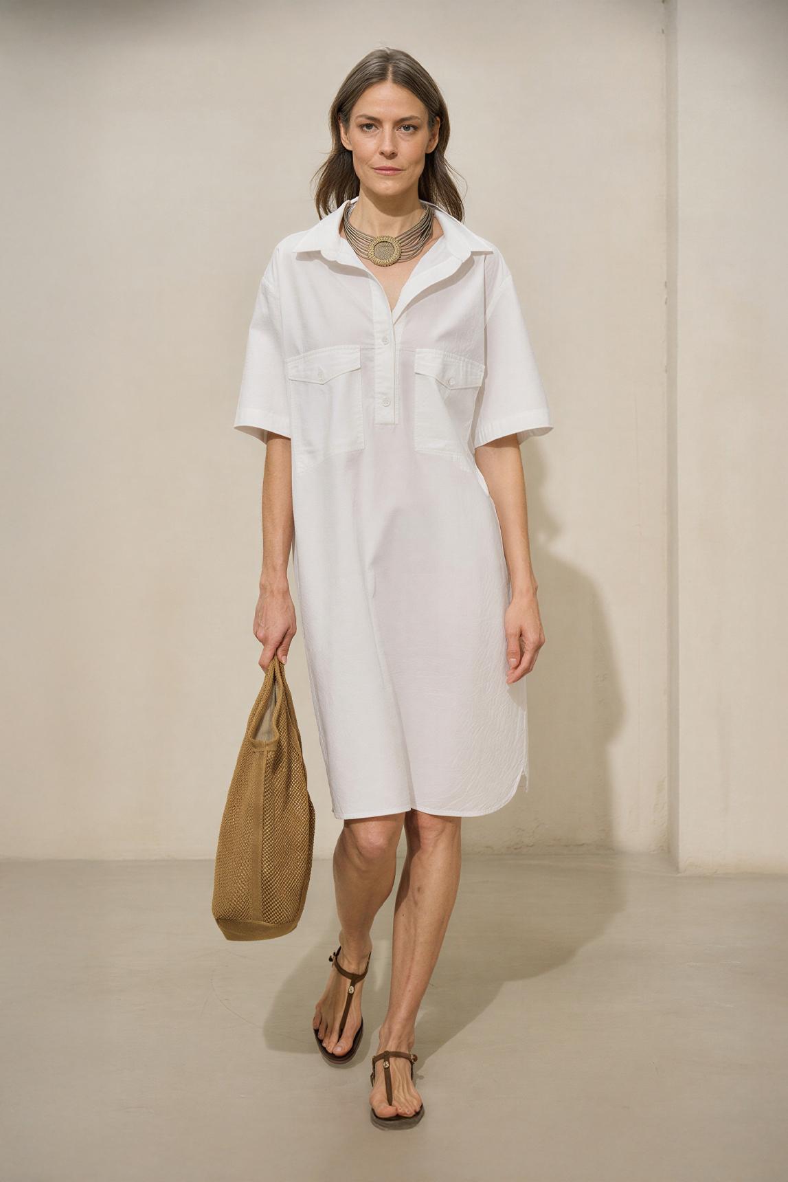 Vestido de mujer en color blanco con silueta camisera fluida, escote abierto y manga corta amplia. El diseño presenta bolsillos de plastrón en el pecho, línea recta de caída suave y un bajo asimétrico ligeramente más largo en la parte trasera, aportando movimiento y una presencia relajada pero cuidada. Su estructura limpia y su acabado liso refuerzan una imagen contemporánea, luminosa y muy favorecedora.